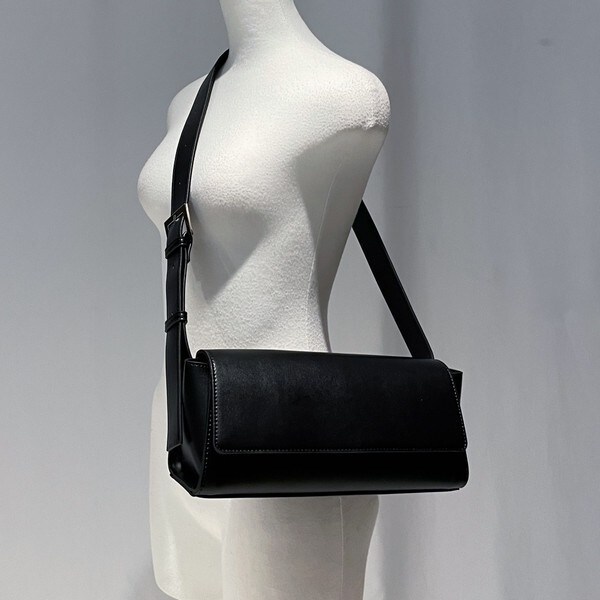 デザイン:モダンなフォルムで洗練された大人の装いを演出するショルダーバッグ。トレンドの長方形シルエットを採用。ミニマルでスマートなフォルムながらも、長財布も入る収納力が魅力的です。調整可能なストラップでショルダーにもクロスボディにもアレンジが可能。