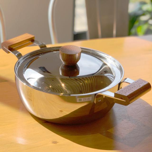 木製の持ち手とつまみが優しい、ステンレスの両手鍋です。燕三条の職人が1つ1つ丁寧に仕上げています。お味噌汁に煮物やカレーにと、料理や人数に合わせてサイズがお選びいただけます。ずっと使い続けたいこだわりが要所に詰まっています。ガスはもちろんIHでもご使用いただけます。